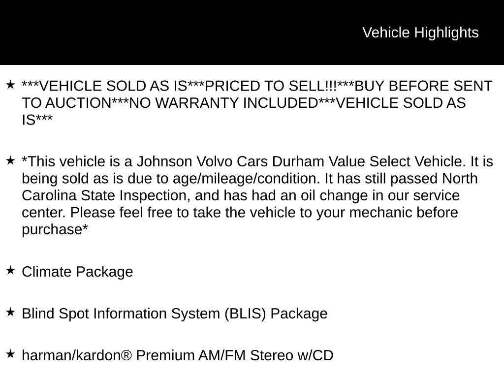 - *This vehicle is a Johnson Volvo Cars Durham Value Select Vehicle. It is being sold as is due to age/mileage/condition. It has still passed North Carolina State Inspection, and has had an oil change in our service center. Please feel free to take the vehicle to your mechanic before purchase*