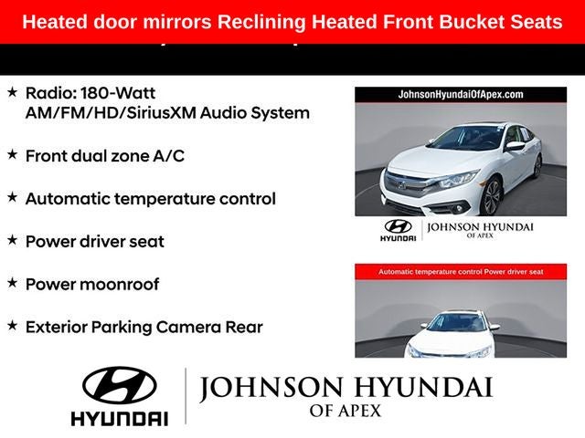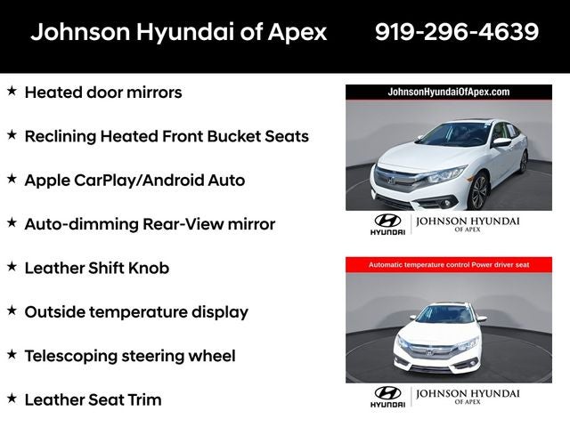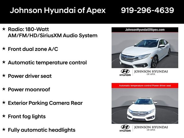 17 Alloy Wheels, Apple CarPlay/Android Auto, Auto-dimming Rear-View mirror, Automatic temperature control, Exterior Parking Camera Rear, Front Bucket Seats, Front dual zone A/C, Front fog lights, Fully automatic headlights, Heated door mirrors, Heated front seats, Leather Seat Trim, Leather Shift Knob, Outside temperature display, Power driver seat, Power moonroof, Radio: 180-Watt AM/FM/HD/SiriusXM Audio System, Reclining Heated Front Bucket Seats, Telescoping steering wheel.