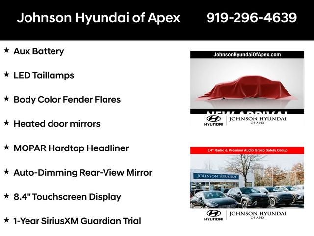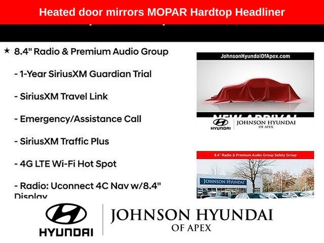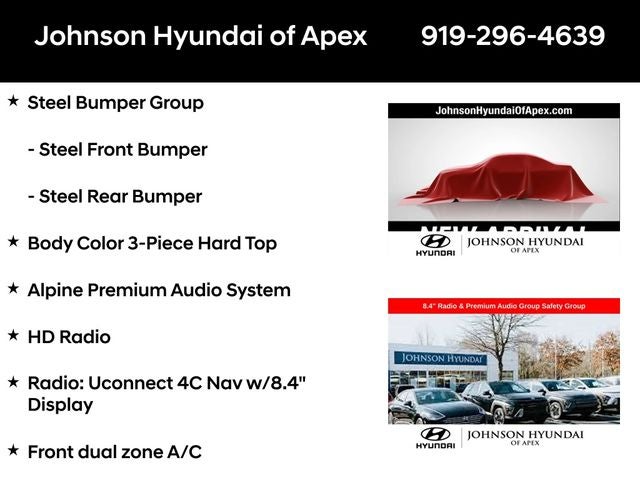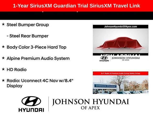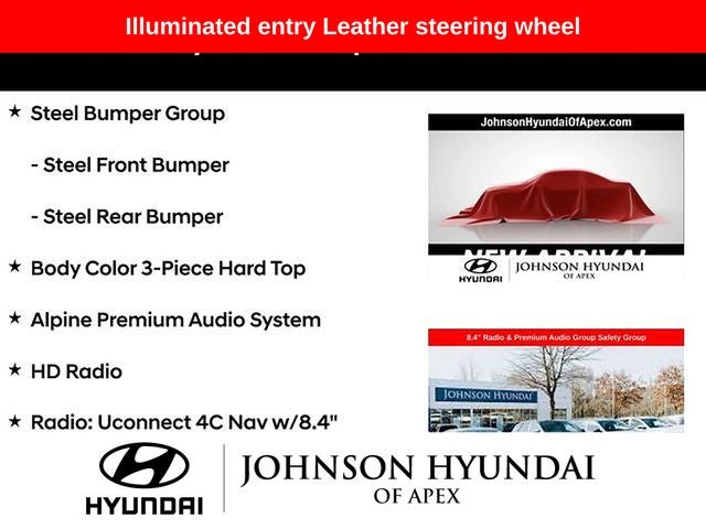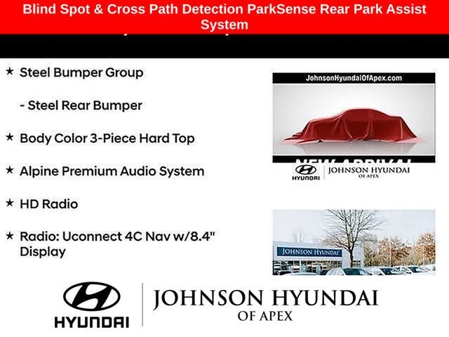 **CERTIFIED BY CARFAX - NO ACCIDENTS!**, **ALL NEW TIRES A $1500 VALUE**, 1-Year SiriusXM Guardian Trial, 4.10 Rear Axle Ratio, 4G LTE Wi-Fi Hot Spot, 5-Year SiriusXM Traffic Service, 5-Year SiriusXM Travel Link Service, 8.4 Radio & Premium Audio Group, 8.4 Touchscreen Display, Alpine Premium Audio System, Apple CarPlay/Android Auto, Auto-Dimming Rear-View Mirror, Automatic temperature control, Aux Battery, Blind Spot & Cross Path Detection, Body Color 3-Piece Hard Top, Body Color Fender Flares, Emergency/Assistance Call, For Details, Visit DriveUconnect.com, Front dual zone A/C, Front fog lights, Fully automatic headlights, GPS Navigation, HD Radio, Heated door mirrors, Illuminated entry, Leather steering wheel, LED Taillamps, MOPAR Hardtop Headliner, ParkSense Rear Park Assist System, ParkView Rear Back-Up Camera, Performance Suspension, Premium Cloth Low-Back Bucket Seats, Quick Order Package 24R, Radio: Uconnect 4C Nav w/8.4 Display, Safety Group, SiriusXM Traffic Plus, SiriusXM Travel Link, Steel Bumper Group, Steel Front Bumper, Steel Rear Bumper, Telescoping steering wheel, Wheels: 17 x 7.5 Machined w/Black Pockets.