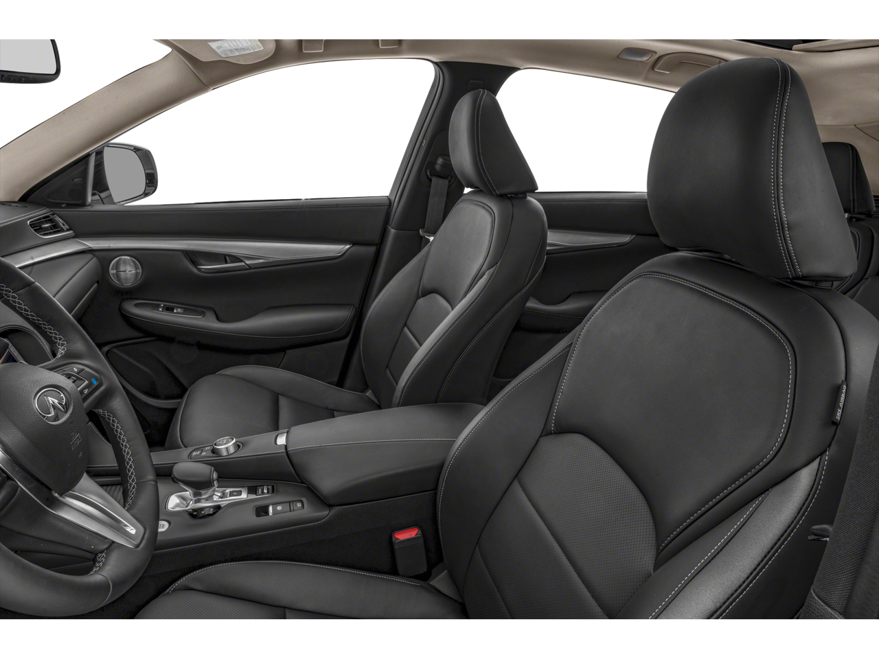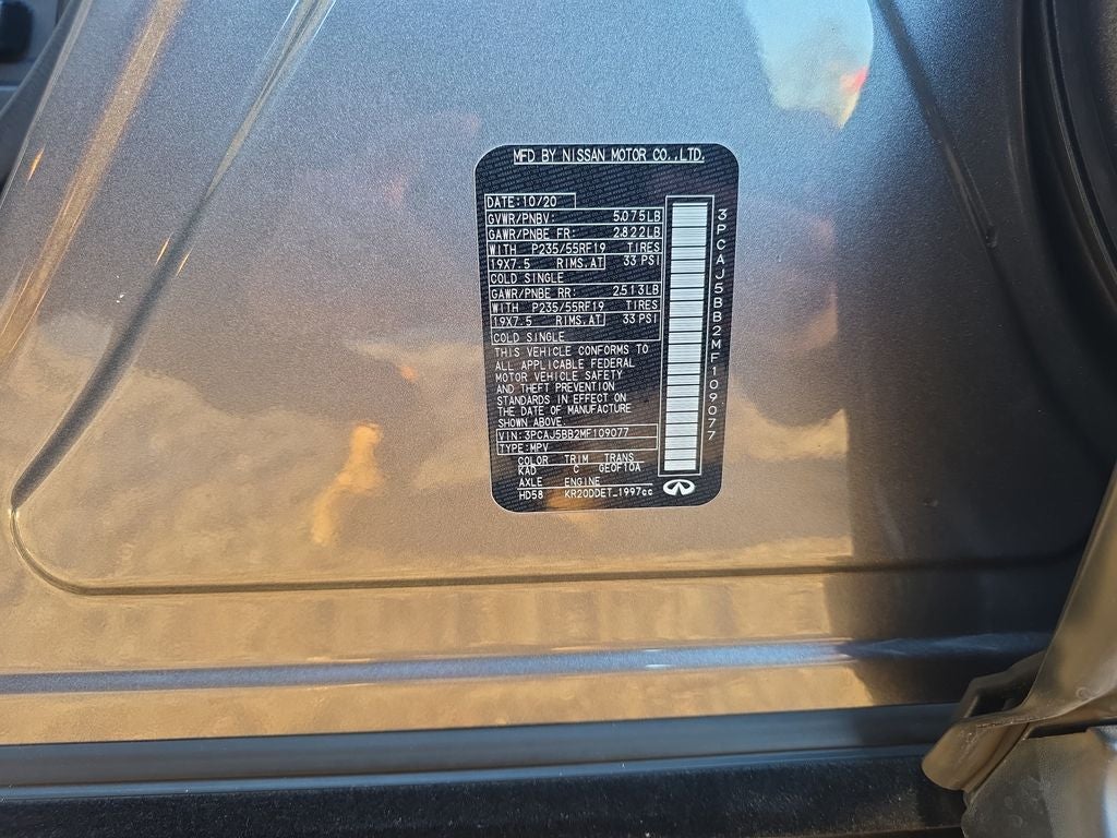 4-Wheel Disc Brakes, 5.846 Axle Ratio, 6 Speakers, ABS brakes, Air Conditioning, Alloy wheels, AM/FM radio: SiriusXM, AM/FM/CD Audio System, Anti-whiplash front head restraints, Apple CarPlay/Android Auto, Auto High-beam Headlights, Auto-dimming Rear-View mirror, Automatic temperature control, Brake assist, Bumpers: body-color, Cargo Package, CD player, Delay-off headlights, Driver door bin, Driver vanity mirror, Dual front impact airbags, Dual front side impact airbags, Electronic Stability Control, Emergency communication system: INFINITI InTouch, Exterior Parking Camera Rear, Floor Mats, Four wheel independent suspension, Front anti-roll bar, Front Bucket Seats, Front Center Armrest, Front dual zone A/C, Front fog lights, Front reading lights, Garage door transmitter: HomeLink, Heated Front Bucket Seats, Heated front seats, Illuminated entry, Illuminated Kick Plates, Knee airbag, Leather Shift Knob, Leatherette Seat Trim, Literature Kit, Low tire pressure warning, Occupant sensing airbag, Outside temperature display, Overhead airbag, Overhead console, Panic alarm, Passenger door bin, Passenger vanity mirror, Power door mirrors, Power driver seat, Power Liftgate, Power moonroof, Power passenger seat, Power steering, Power windows, Radio data system, Rear anti-roll bar, Rear Parking Sensors, Rear reading lights, Rear seat center armrest, Rear side impact airbag, Rear window defroster, Rear window wiper, Remote keyless entry, Security system, Speed control, Speed-sensing steering, Speed-Sensitive Wipers, Splash Guards (Set of 4), Split folding rear seat, Spoiler, Steering wheel mounted audio controls, Tachometer, Telescoping steering wheel, Tilt steering wheel, Traction control, Trip computer, Turn signal indicator mirrors, Variably intermittent wipers, Wheels: 19 x 7.5J Silver Painted Alloy.
