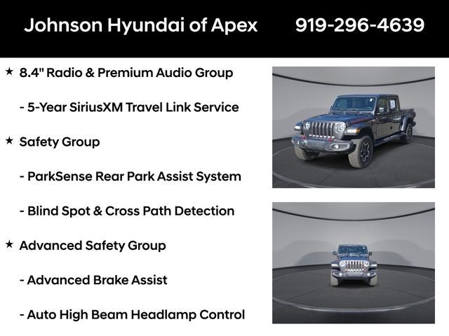 1-Year SiriusXM Guardian Trial, 240 Amp Alternator, 5-Year SiriusXM Traffic Service, 5-Year SiriusXM Travel Link Service, 700 Amp Maintenance Free Battery, 8.4 Radio & Premium Audio Group, 8.4 Touchscreen Display, Advanced Brake Assist, Advanced Safety Group, Alpine Premium Audio System, Apple CarPlay/Android Auto, Auto High Beam Headlamp Control, Auto-Dimming Rear-View Mirror, Automatic temperature control, Auxiliary Switch Group, Auxiliary Switches, Black 3-Piece Hard Top, Blind Spot & Cross Path Detection, Body Color Fender Flares (2-Piece), Class IV Hitch Receiver, Cold Weather Group, Emergency/Assistance Call, For Details, Visit DriveUconnect.com, Freedom Panel Storage Bag, Front dual zone A/C, Full Length Floor Console Premium Armrest, Full Speed Forward Collision Warning Plus, Fully automatic headlights, GPS Navigation, GVWR: 6,250 lbs w/Max Tow Package, HD Radio, Heated door mirrors, Heated Front Seats, Heated Steering Wheel, Heavy-Duty Engine Cooling, Leather steering wheel, Leather Trimmed Bucket Seats, Leather Wrapped Park Brake Handle, Leather Wrapped Shift Knob, MOPAR Spray In Bedliner, Outside temperature display, ParkSense Rear Park Assist System, Performance Suspension, Premium Door Trim Panel, Quick Order Package 24R, Radio: Uconnect 4C Nav w/8.4 Display, Rear Armrest w/Cupholder Seat, Rear Sliding Window, Rear Window Defroster, Safety Group, SiriusXM Traffic Plus, SiriusXM Travel Link, Telescoping steering wheel, Trailer Hitch Zoom, Trailer Tow Package.