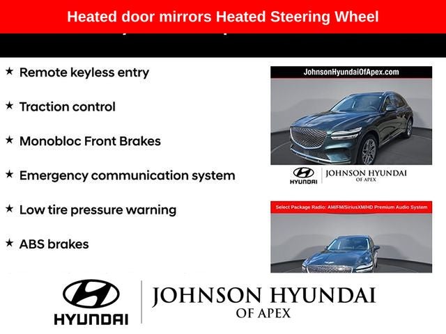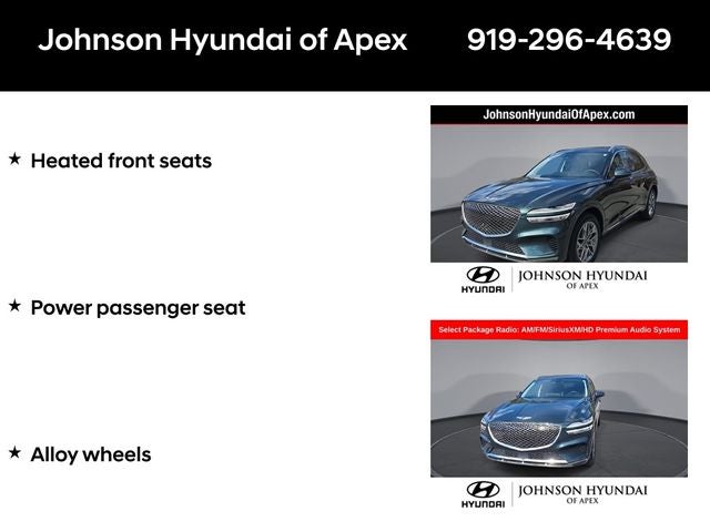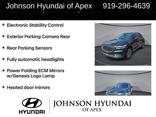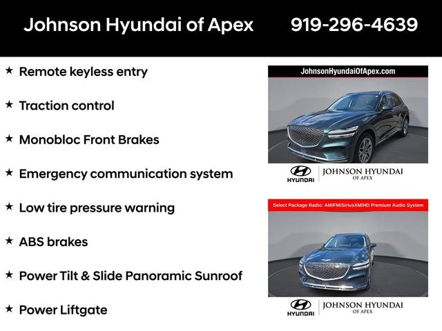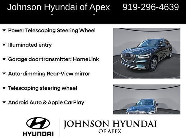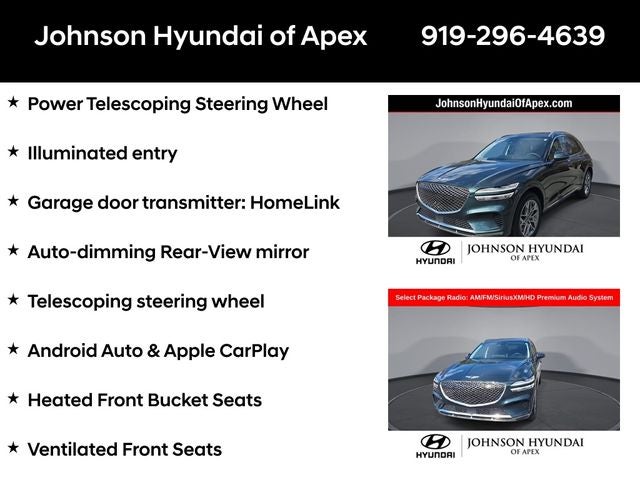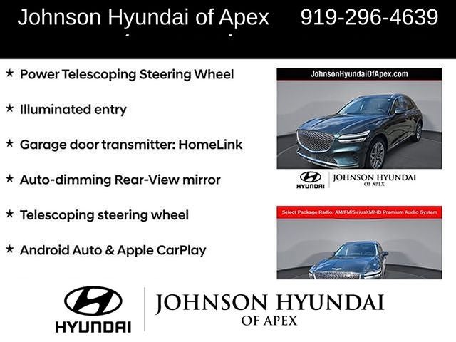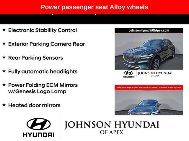 ABS brakes, Alloy wheels, Android Auto & Apple CarPlay, Auto-dimming Rear-View mirror, Automatic temperature control, Electronic Stability Control, Emergency communication system, Exterior Parking Camera Rear, Front dual zone A/C, Fully automatic headlights, Garage door transmitter: HomeLink, Heated door mirrors, Heated Front Bucket Seats, Heated front seats, Heated Steering Wheel, Illuminated entry, Integrated Memory System (IMS), Low tire pressure warning, Monobloc Front Brakes, Navigation System, Option Group 02, Power driver seat, Power Folding ECM Mirrors w/Genesis Logo Lamp, Power Liftgate, Power passenger seat, Power Telescoping Steering Wheel, Power Tilt & Slide Panoramic Sunroof, Radio: AM/FM/SiriusXM/HD Premium Audio System, Rear Parking Sensors, Remote keyless entry, Select Package, Telescoping steering wheel, Traction control, Ventilated Front Seats.