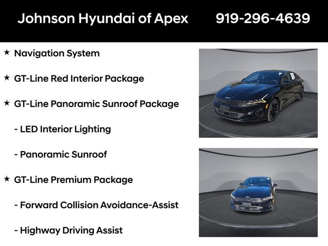 Apple CarPlay & Android Auto, Automatic temperature control, Forward Collision Avoidance-Assist, Front dual zone A/C, Front fog lights, Fully automatic headlights, Gloss Black Pillar & Door Frame Cover, GT-Line Panoramic Sunroof Package, GT-Line Premium Package, GT-Line Red Interior Package, Heated door mirrors, Heated Front Bucket Seats, Heated steering wheel, Highway Driving Assist, LED Interior Lighting, LED Projection Headlamps, Navigation System, Outside temperature display, Panoramic Sunroof, Power driver seat, Smart Cruise Control w/Stop & Go, Telescoping steering wheel, Wheels: 18 Gloss Black Machined Finish Alloy.