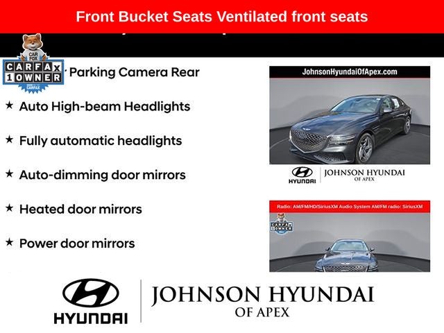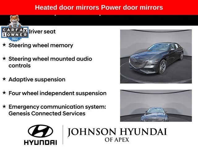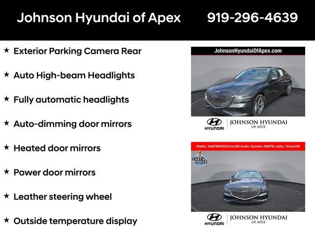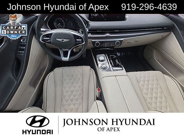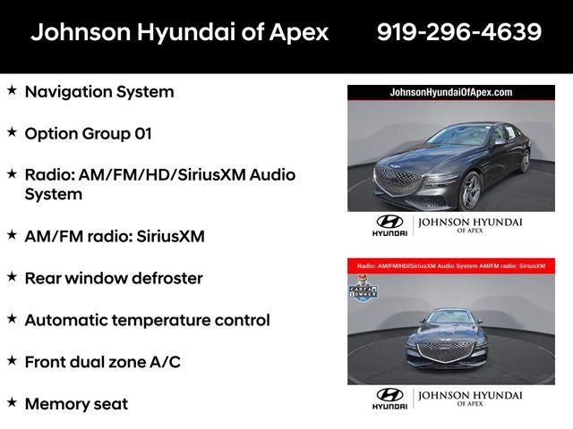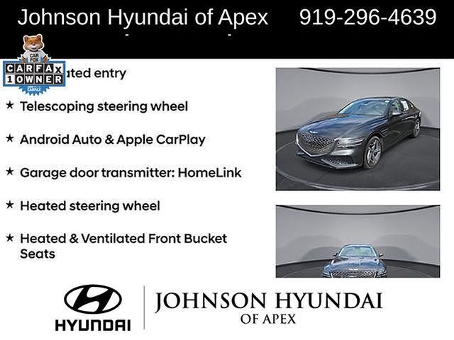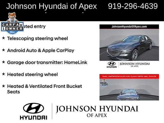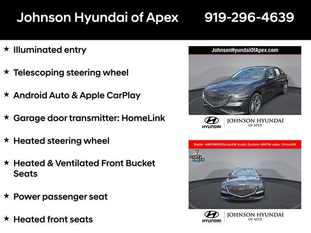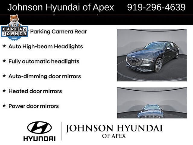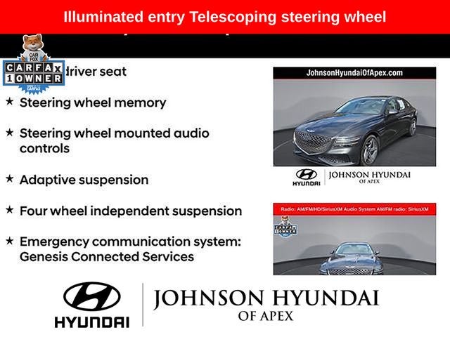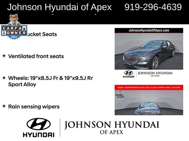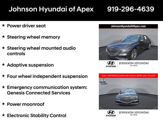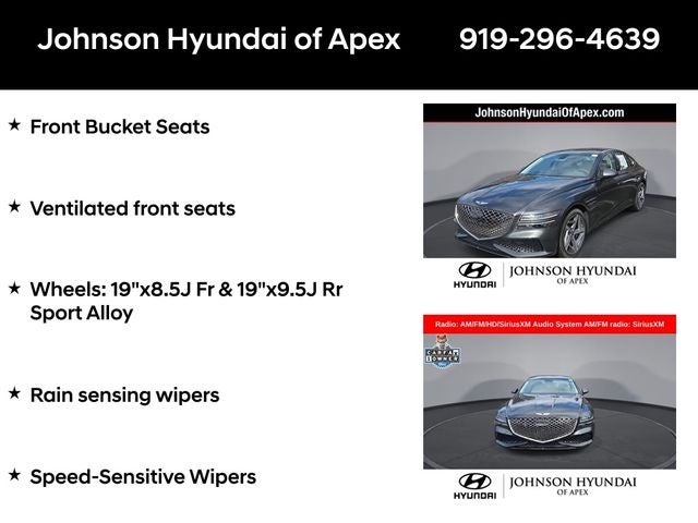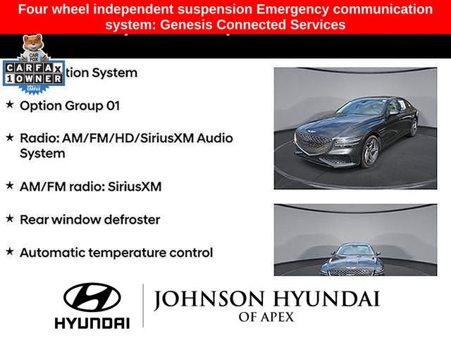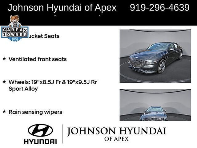 Adaptive suspension, AM/FM radio: SiriusXM, Android Auto & Apple CarPlay, Auto High-beam Headlights, Auto-dimming door mirrors, Automatic temperature control, Electronic Stability Control, Emergency communication system: Genesis Connected Services, Exterior Parking Camera Rear, Four wheel independent suspension, Front Bucket Seats, Front dual zone A/C, Fully automatic headlights, Garage door transmitter: HomeLink, Heated & Ventilated Front Bucket Seats, Heated door mirrors, Heated front seats, Heated steering wheel, Illuminated entry, Leather steering wheel, Memory seat, Navigation System, Option Group 01, Outside temperature display, Power door mirrors, Power driver seat, Power moonroof, Power passenger seat, Radio: AM/FM/HD/SiriusXM Audio System, Rain sensing wipers, Rear window defroster, Speed-Sensitive Wipers, Steering wheel memory, Steering wheel mounted audio controls, Telescoping steering wheel, Ventilated front seats, Wheels: 19x8.5J Fr & 19x9.5J Rr Sport Alloy.