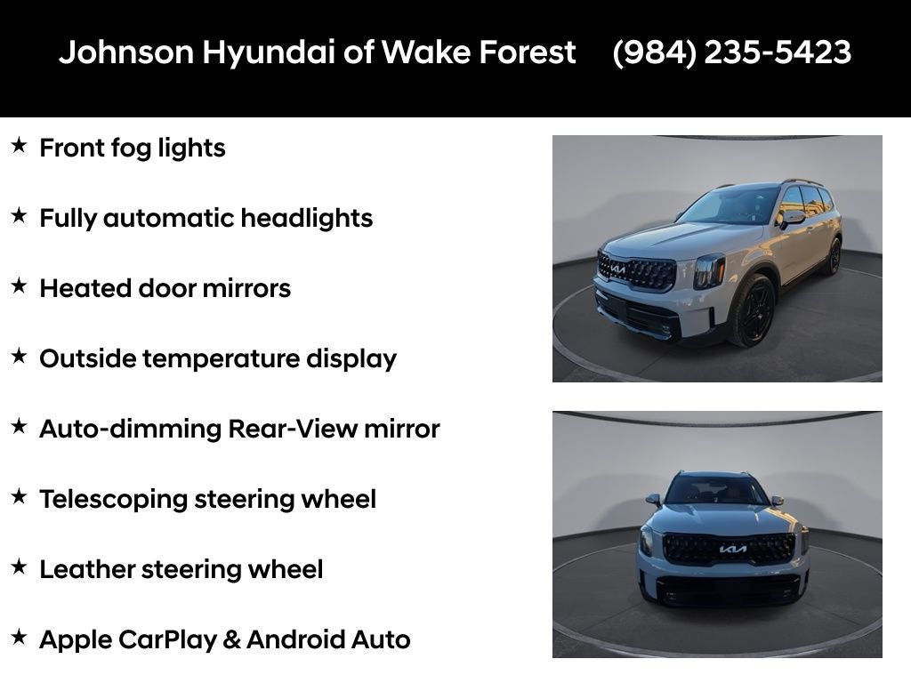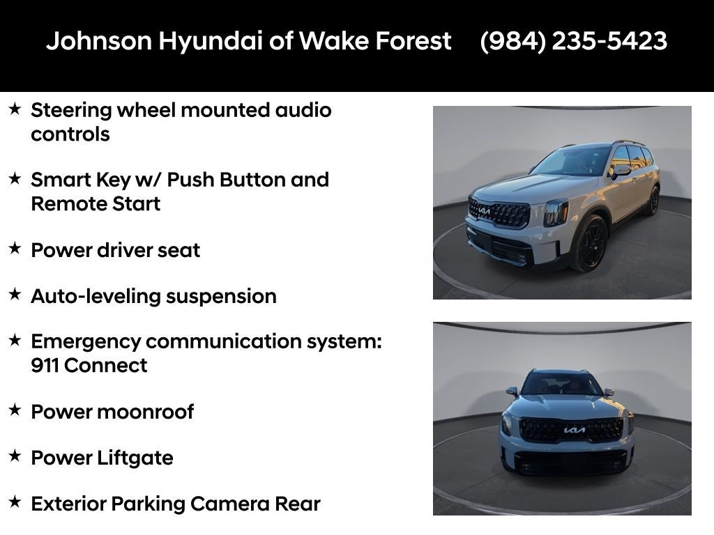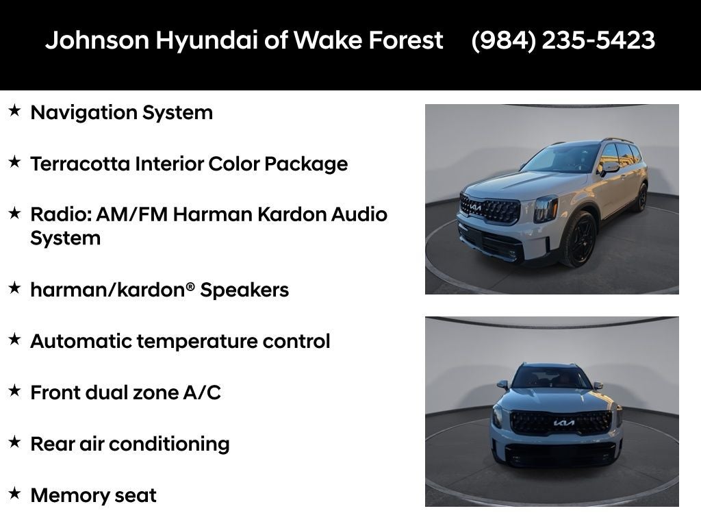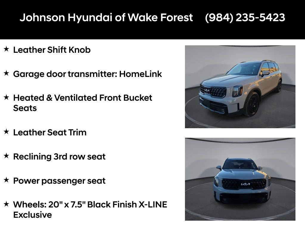 Apple CarPlay & Android Auto, Auto-dimming Rear-View mirror, Auto-leveling suspension, Automatic temperature control, Emergency communication system: 911 Connect, Exterior Parking Camera Rear, Front dual zone A/C, Front fog lights, Fully automatic headlights, Garage door transmitter: HomeLink, harman/kardon® Speakers, Heated & Ventilated Front Bucket Seats, Heated door mirrors, Leather Seat Trim, Leather Shift Knob, Leather steering wheel, Memory seat, Navigation System, Outside temperature display, Power driver seat, Power Liftgate, Power moonroof, Power passenger seat, Radio: AM/FM Harman Kardon Audio System, Rear air conditioning, Reclining 3rd row seat, Smart Key w/ Push Button and Remote Start, Steering wheel mounted audio controls, Telescoping steering wheel, Terracotta Interior Color Package, Wheels: 20 x 7.5 Black Finish X-LINE Exclusive, 10 Speakers, 3.648 Axle Ratio, 3rd row seats: split-bench, 4-Wheel Disc Brakes, ABS brakes, Air Conditioning, Alloy wheels, AM/FM radio: SiriusXM, Auto High-beam Headlights, Brake assist, Bumpers: body-color, Carpet Floor Mats, Compass, Delay-off headlights, Driver door bin, Driver vanity mirror, Dual front impact airbags, Dual front side impact airbags, Electronic Stability Control, Four wheel independent suspension, Front anti-roll bar, Front Bucket Seats, Front Center Armrest, Front reading lights, Heated front seats, Heated steering wheel, Illuminated entry, Knee airbag, Low tire pressure warning, Occupant sensing airbag, Overhead airbag, Overhead console, Panic alarm, Passenger door bin, Passenger vanity mirror, Power door mirrors, Power steering, Power windows, Radio data system, Rear anti-roll bar, Rear audio controls, Rear reading lights, Rear side impact airbag, Rear window defroster, Rear window wiper, Remote keyless entry, Roof rack: rails only, Security system, Speed control, Speed-sensing steering, Split folding rear seat, Spoiler, Tachometer, Tilt steering wheel, Traction control, Trip computer, Turn signal indicator mirrors, Variably intermittent wipers, Ventilated front seats, Apple CarPlay & Android Auto, Auto-dimming Rear-View mirror, Auto-leveling suspension, Automatic temperature control, Emergency communication system: 911 Connect, Exterior Parking Camera Rear, Front dual zone A/C, Front fog lights, Fully automatic headlights, Garage door transmitter: HomeLink, harman/kardon® Speakers, Heated & Ventilated Front Bucket Seats, Heated door mirrors, Leather Seat Trim, Leather Shift Knob, Leather steering wheel, Memory seat, Navigation System, Outside temperature display, Power driver seat, Power Liftgate, Power moonroof, Power passenger seat, Radio: AM/FM Harman Kardon Audio System, Rear air conditioning, Reclining 3rd row seat, Smart Key w/ Push Button and Remote Start, Steering wheel mounted audio controls, Telescoping steering wheel, Terracotta Interior Color Package, Wheels: 20 x 7.5 Black Finish X-LINE Exclusive.